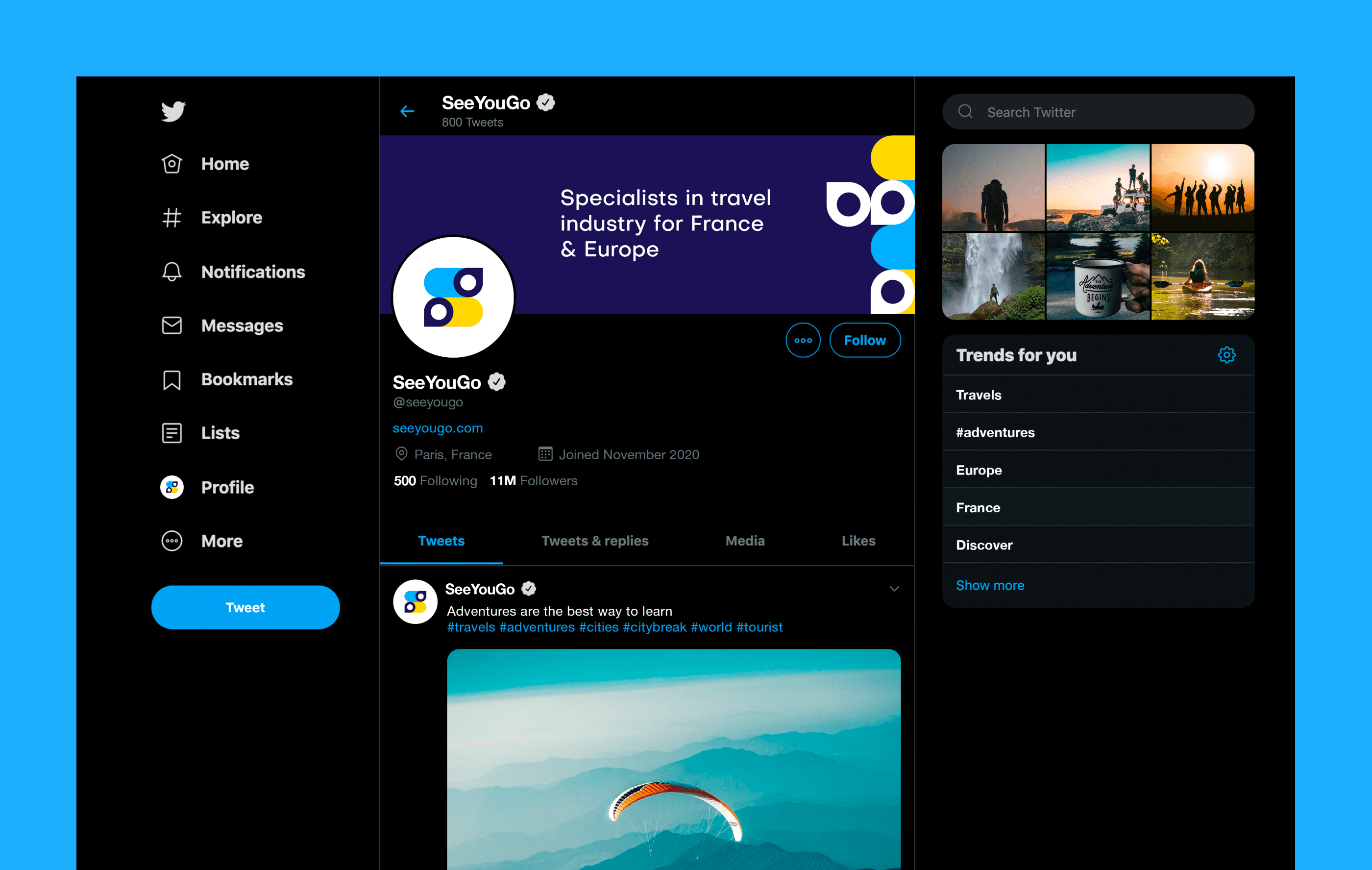 A vibrant brand identity for a French travel organization specializing in unique, high-energy experiences across 10+ European destinations.